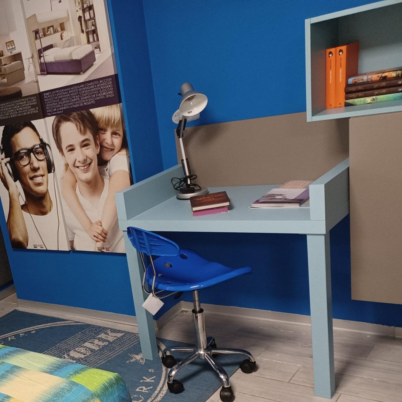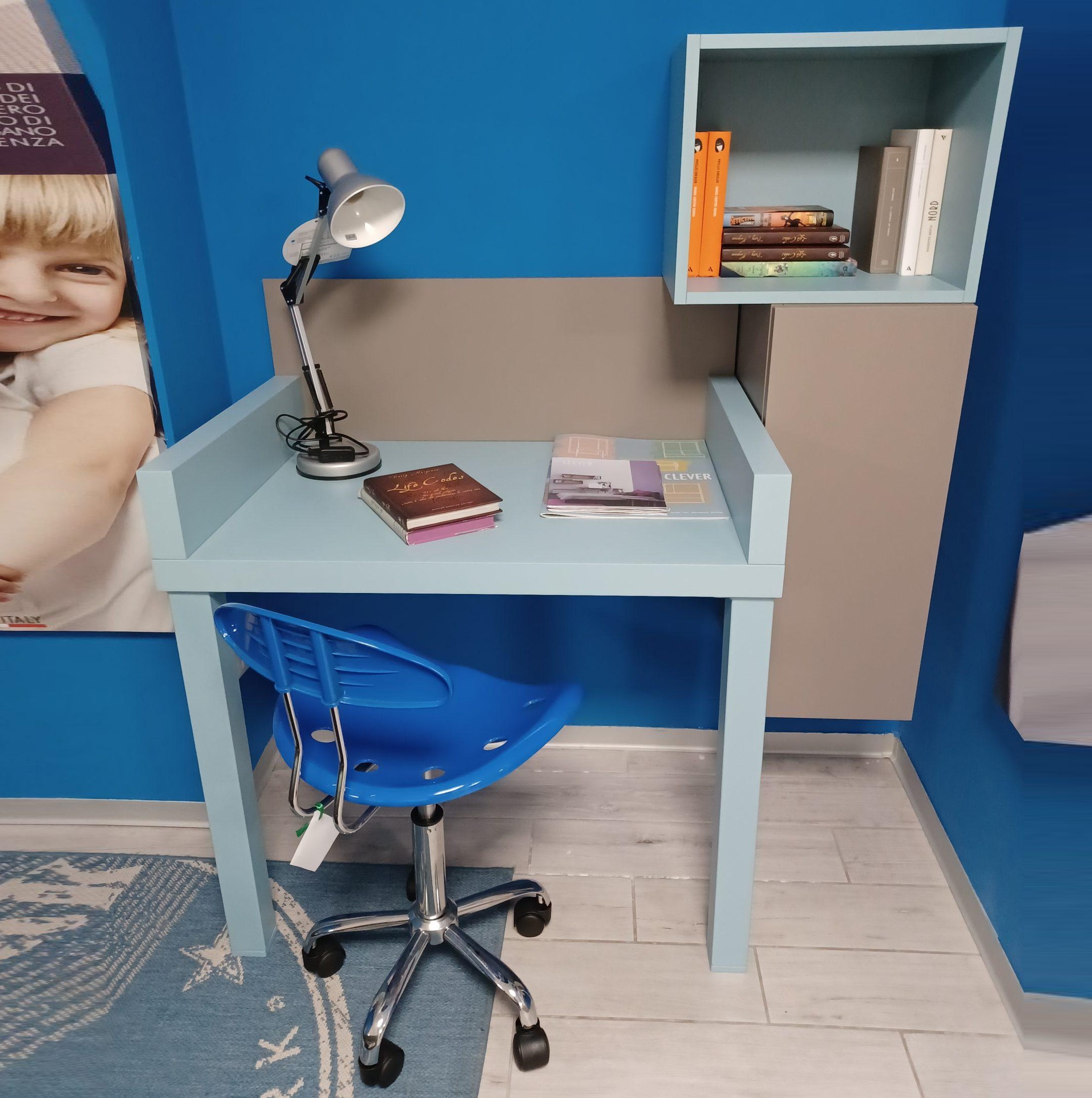• Scrittoio con gambe anteriori ancorato a muro colore cielo/platino. Misure: L. 90 cm ; P. 60.8 cm.